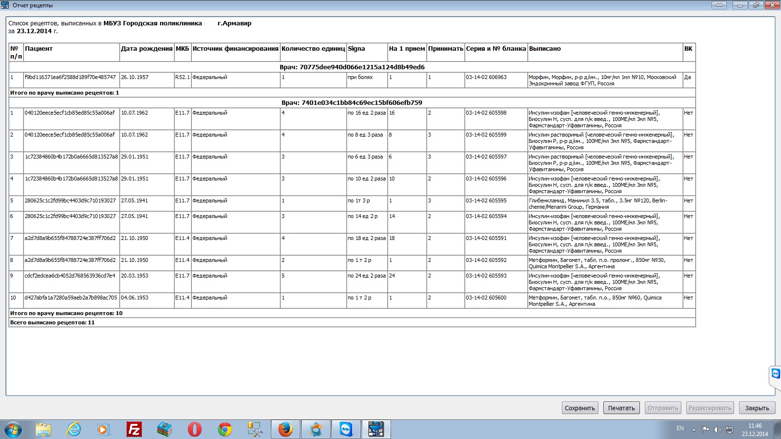 1) Добавлен второй отчет. В самом начале диалога выбирается отчет (1. Отчет о выписанных рецептах, 2. Отчет по приложениям (этот отчет сдается в управление каждую неделю));