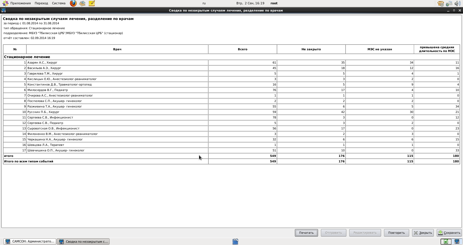 2. Какое количество пациентов обслужил каждый врач (в поликлиниках и стационарах) и в данный момент обслуживает.
