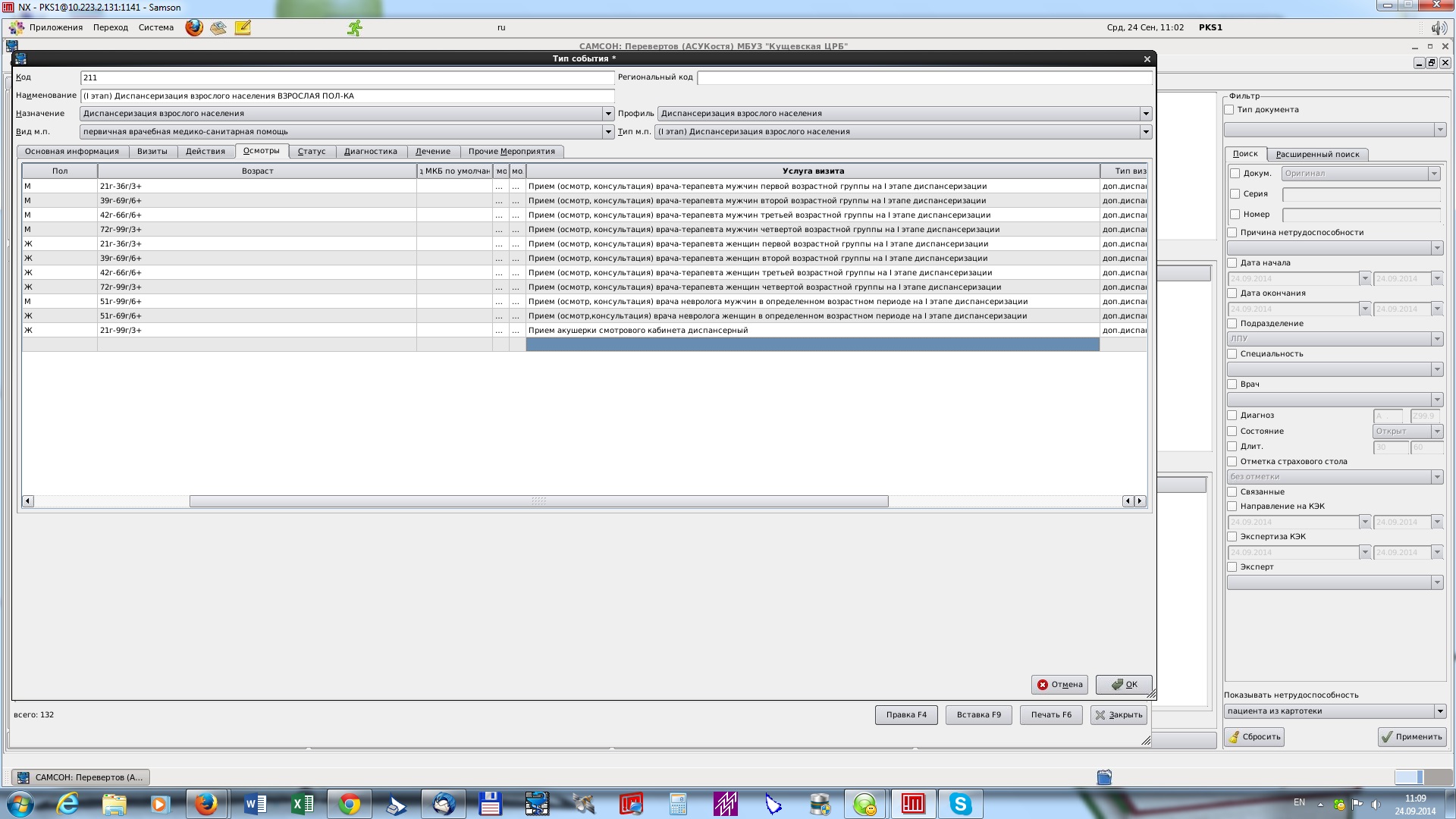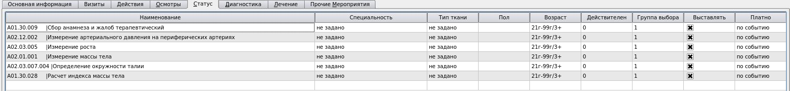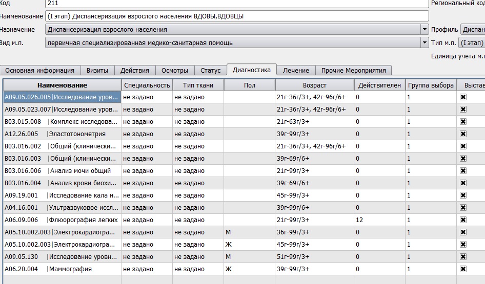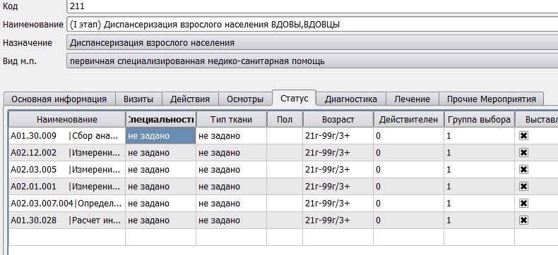 Пробовали создать тип событий (I этап) Диспансеризация взрослого населения ВДОВЫ,ВДОВЦЫ, вот как настроены вкладки с услугами