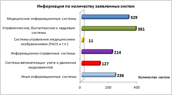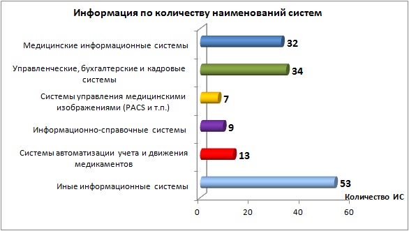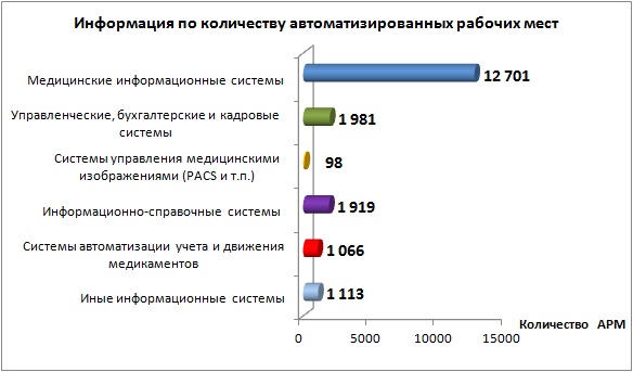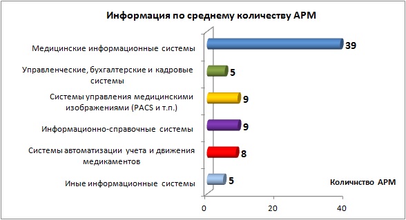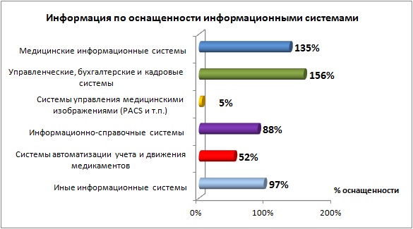 Анализ 244 реестров информационных систем учреждений (приложения к плану на 2015 год) показал, что в медицинских организациях в 2015 году планируется использовать 1 298 информационных систем 148 наименований на 18 878 автоматизированных рабочих местах (АРМ). В среднем в одной информационной системе 14 автоматизированных рабочих мест. Так, медицинские организации оснащены медицинскими информационными системами на 135%, управленческими, бухгалтерскими и кадровыми системами на 156%, системами управления медицинскими изображениями на 5%, информационно-справочными системами на 88%, системами автоматизации учета и движения медикаментов - на 52% (из них системы по выписке льготных рецептов составляют 25%, а системы автоматизации внутрибольничной аптеки - 27%), иными информационными системами на 97%.