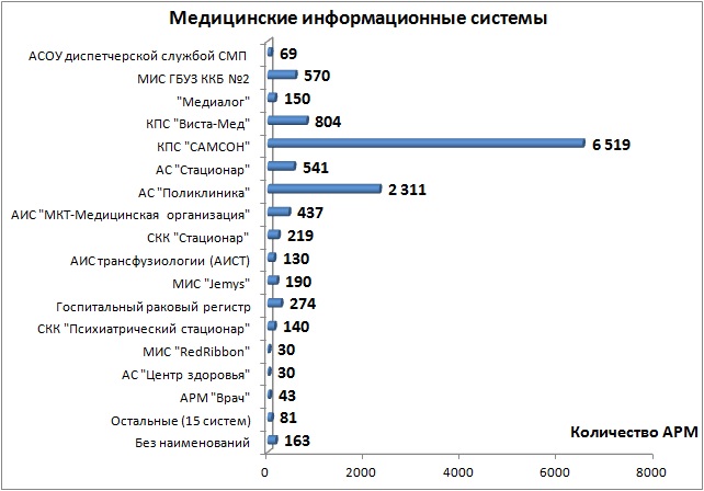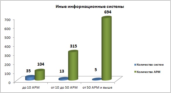 Иные информационные системы состоят из 53 наименований, которые можно разбить на три группы: до 10 АРМ – 35 наименования, 88 рабочих мест; от 10 до 50 АРМ – 13 наименований, 315 рабочих мест; от 50 АРМ и выше – 5 наименований, 694 рабочих места. Для справки: для 16 АРМ не указано наименование информационной системы. В наименования с количеством АРМ от 50 и выше входят системамы Total Network Inventory 3, Лабораторная исследовательская система, АИС трансфузиологии (АИСТ), АСОУ диспетчерской службой СМП, АС «Поликлиника». Системы с количеством до 50 АРМ включили в себя широкий список наименований: от Медицинских информационных систем до систем «АвтоГраф» и Call-центр.Отметим что к данной группе, на наш взгляд, некорректно отнесенные такие системы как: АСОУ Диспетчерской службой СМП, КМИВЦ, АИС "Трансфузиологии" (АИСТ), АС "Поликлиника", АРМ "Льготные рецепты", ИСУ "Парус".
