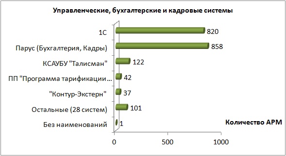 Список систем состоит из 5 основных наименований, работа с которыми организована на 1 879 АРМ. Для остальных 28 наименований (с количеством рабочих мест до 10) – на 101 АРМ. Для справки: для 1 АРМ не указано наименование информационной системы.