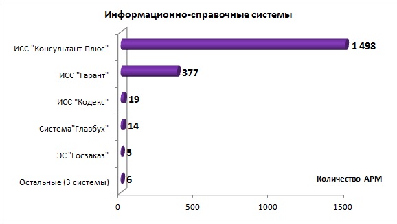 В данном разделе основными заявленными системами являются Справочно-правовая система "Консультант Плюс" и Информационно-правовое обеспечение "Гарант", что может говорить о популярности данных систем среди специалистов многих квалификаций, а также о необходимости обработки справочно-правовой информации в автоматизированном режиме. Системы, представленные небольшим количеством рабочих мест, являются дополнительными средствами получения квалифицированной помощи по узконаправленным вопросам.