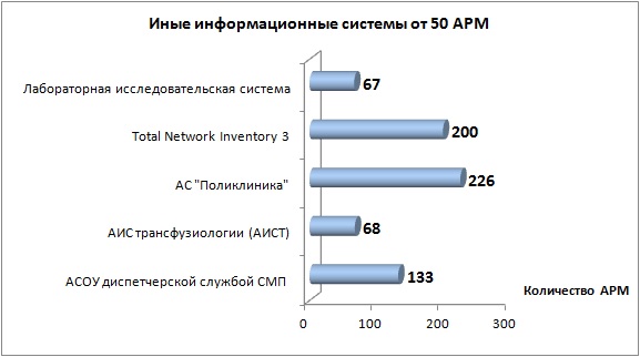 В наименования с количеством АРМ от 50 и выше входят системамы Total Network Inventory 3, Лабораторная исследовательская система, АИС трансфузиологии (АИСТ), АСОУ диспетчерской службой СМП, АС «Поликлиника».