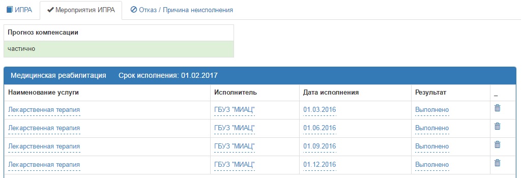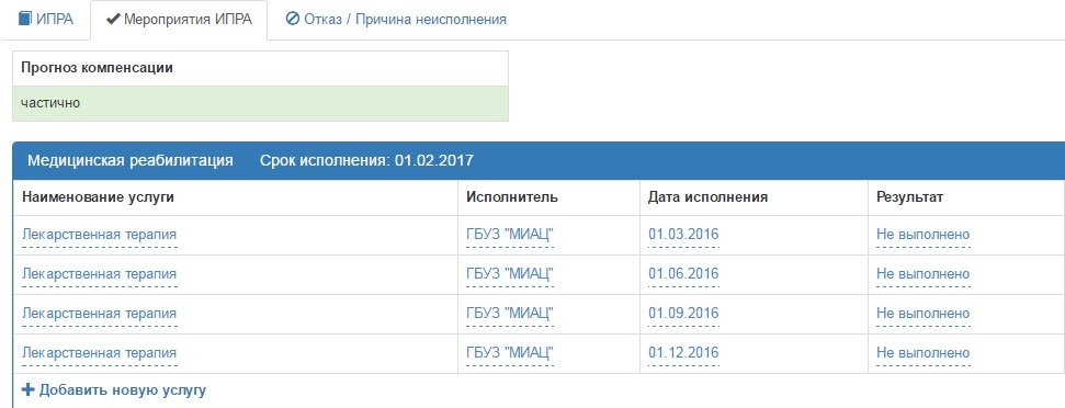 Предположим, что есть пациент Иванов Иван Иванович, у которого дата МСЭ 01.01.2016 и действителен по 01.02.2017 и пациенту необходимо 1 раз в 3 месяца появляться за получением лекарства до конца срока ИПРА. Поэтому для данного пациента необходимо добавить комплекс мероприятий на каждую дату посещения.