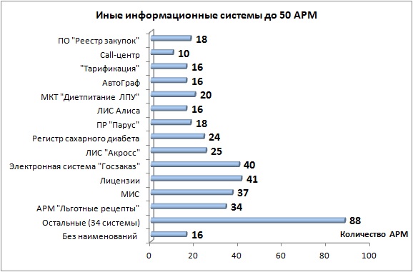 Иные информационные системы состоят из 53 наименований, которые можно разбить на три группы: до 10 АРМ – 35 наименования, 88 рабочих мест; от 10 до 50 АРМ – 13 наименований, 315 рабочих мест; от 50 АРМ и выше – 5 наименований, 694 рабочих места. Для справки: для 16 АРМ не указано наименование информационной системы.